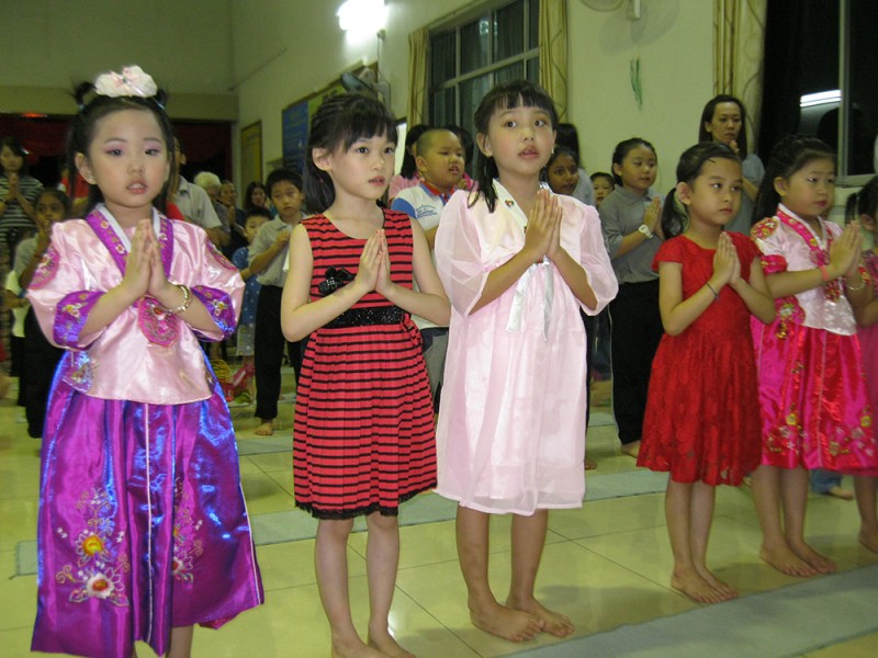 当天午后,天空开始飘下绵绵细雨;净苑厨房里则飘来一阵阵香喷喷的味道;大殿里已设了一个颇有中秋气息的小舞台,筹委及义工们正为当晚的盛会做最后的打点。