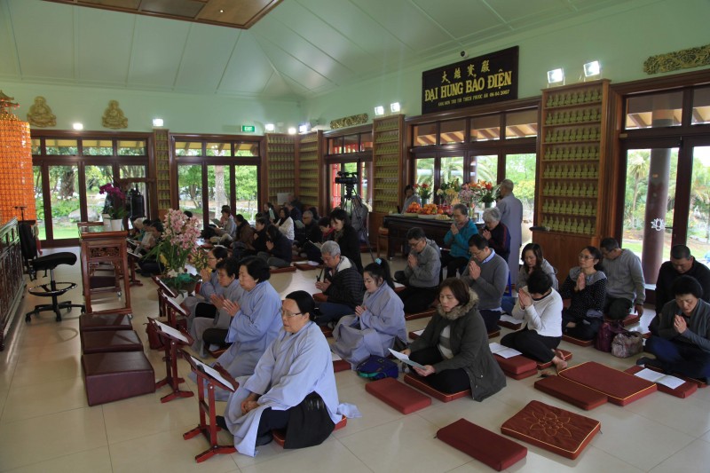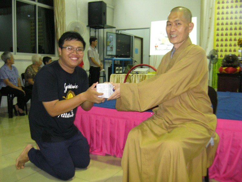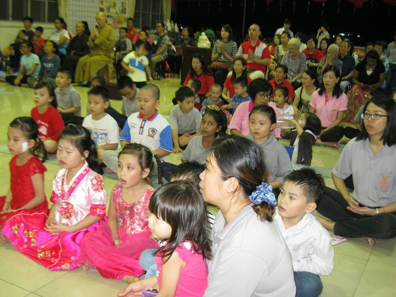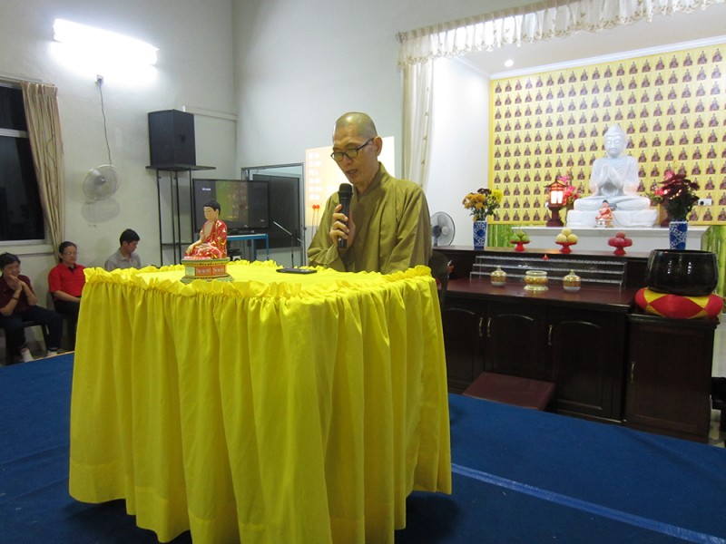 傍晚7时30分,享用了茶点的来宾们聚集在佛殿里,大众在奕燕师姐的带领下念佛共修。接着檀香寺男众监院上真下如法师为当晚的中秋团圆共修会慈悲开示。真如法师首先道出民间欢庆中秋节之三个原因: 1) 聚会:这是个与家人亲友,欢庆秋季丰收的聚会;2) 感恩:感恩能与家人亲友团聚,共庆中秋佳节;3) 祈祷:对月神 (嫦娥) 祈祷,祈求来年福乐的延续。