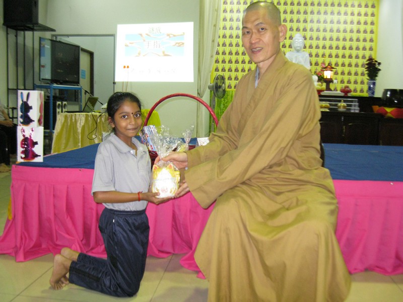 法师开示后,便是射灯谜环节。当晚共有十个灯谜让大众解答,小菩萨们皆踊跃尝试。猜对灯谜的参赛者欢喜地向真如法师接过一份小小礼物。