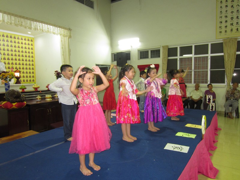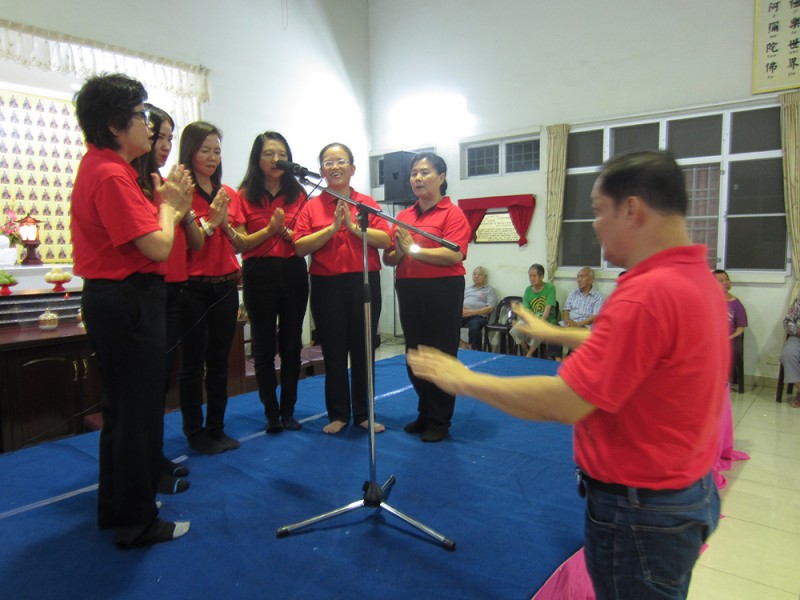 歌曲唱毕,《我们的月亮一定圆》的音乐再度响起,双溪大年阿都哈林师范学院学员以另一种方式演绎这首曲子,让现场倍感中秋团圆的温馨。此外,他们还演绎了一首别出心裁的杯子歌。十个杯子在十双巧手伶俐地摆动下,跟着拍子发出歌曲节奏,令人耳目一新。接着大众静下心来,聆听檀香净苑佛曲班成员在声乐老师杨木钦居士指挥下献唱三首歌曲:《竹园之歌》、《妙哉菩提叶》和《送别》,从佛曲中领会佛法的奥秘。最后,檀香周五佛学班的学生呈献手语《佛陀牵着我的手》,让大家谨记虽然如今佛陀已不在,佛法依然在,奉行佛陀的教诲,就像佛陀牵着我们的手。