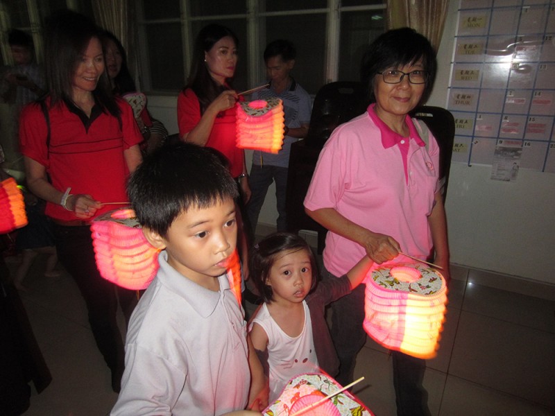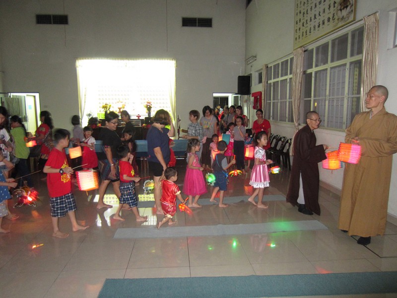 观赏了余兴节目,接下来是提灯笼游行。由于当晚天不作美,不能在户外提灯笼游行,大众只好在两位师父带领下在室内提灯笼。大众小心翼翼地点亮了灯笼,一边哼着《佛化中秋歌》,一边提着灯笼跟着师父从幼儿园绕到晚晴苑再到回到佛殿。此刻,佛殿熄了灯,大众以绕佛的形式提灯笼,一排排灯笼亮出点点亮光,显示一片祥和!