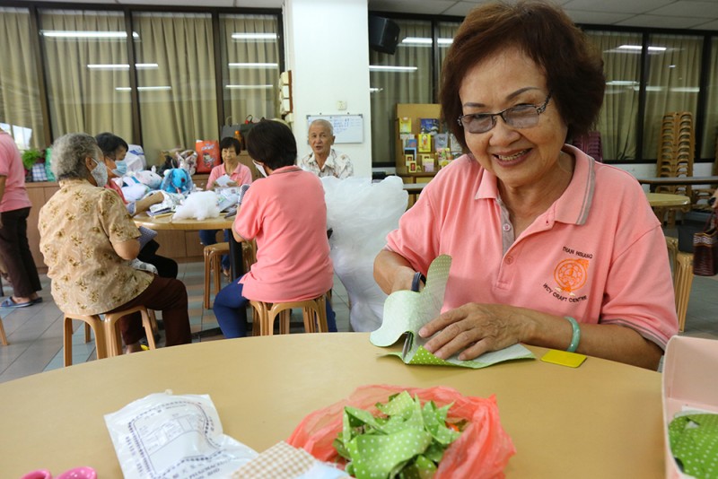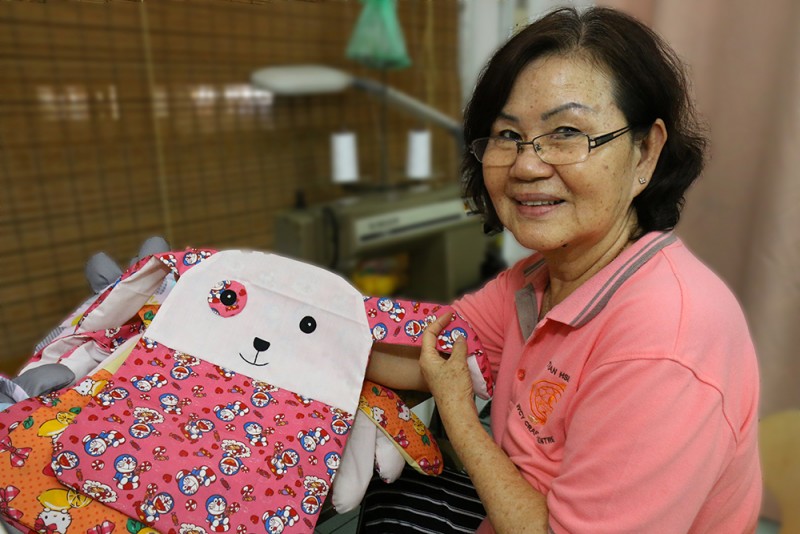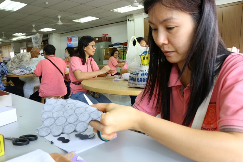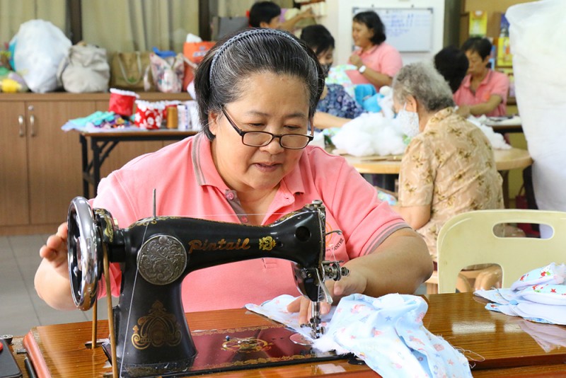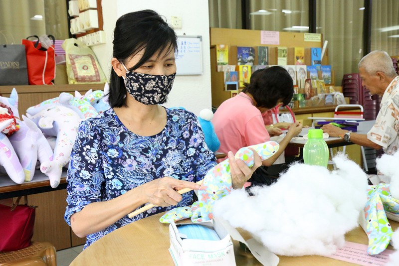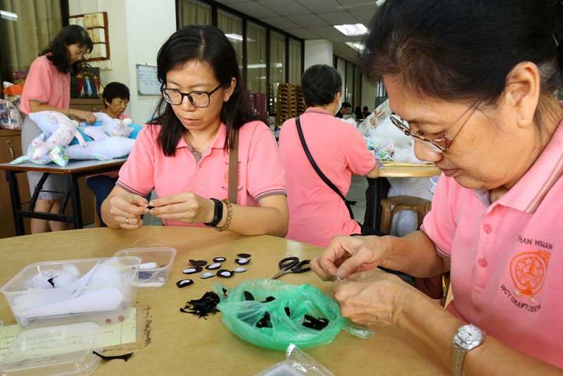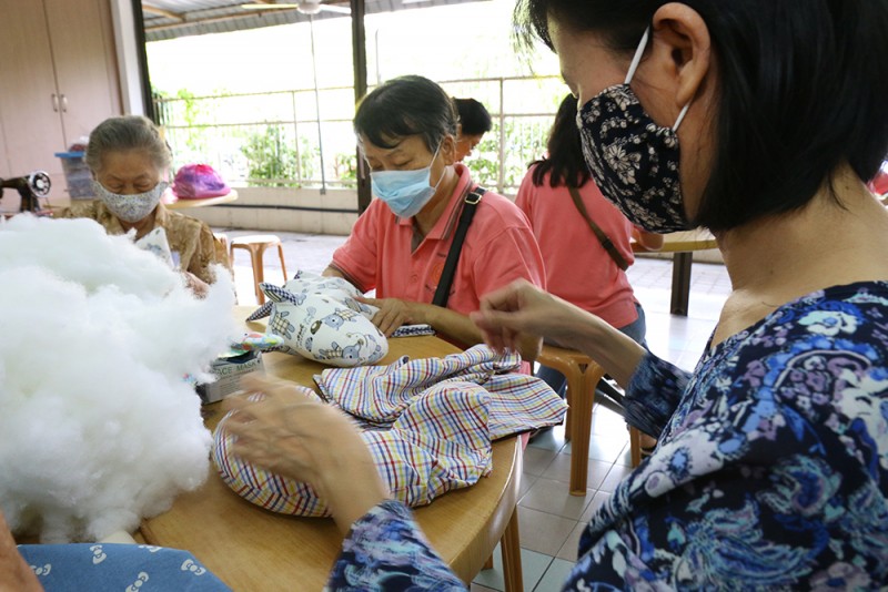 受英文教育的Celina师姐以中文加福建话说,目前手工艺班成员除了一名男士之外,其余皆为女性。虽然人数有约40名,但不是所有人都能每场出席。他们以有限的资源及人力每周二在檀香寺底层的多用途礼堂及食堂的一个角落埋头忙碌。Celina师姐说,中心会在了解义工的兴趣所向及专长后,根据义工的能力来给她们分配任务。产品的设计、裁剪、缝纫,到零碎的塞棉花等等流程,都由总数约20名的义工们各司其职,在不同组别的生产线中,完成制成品。