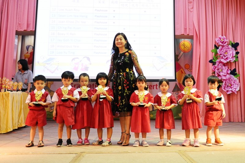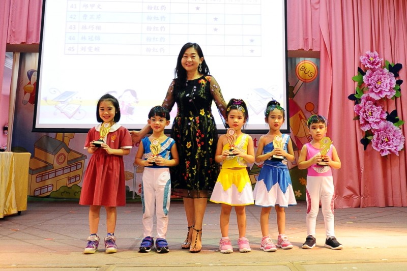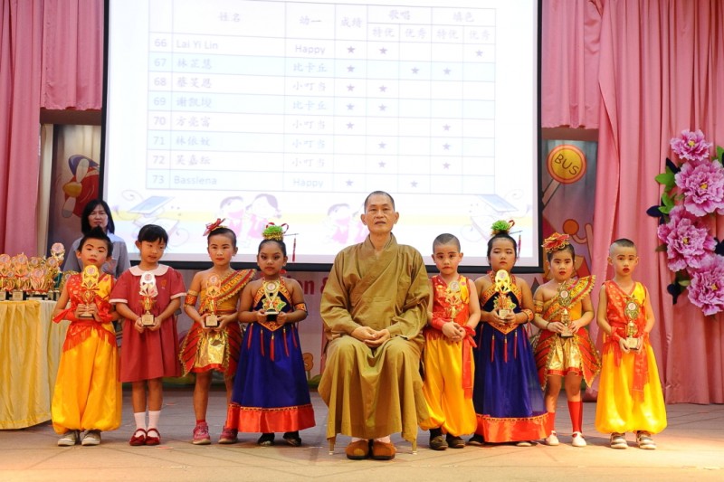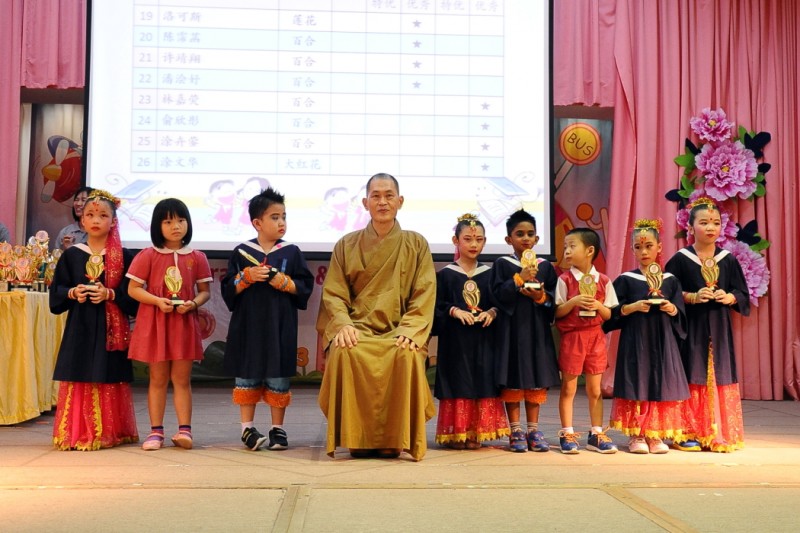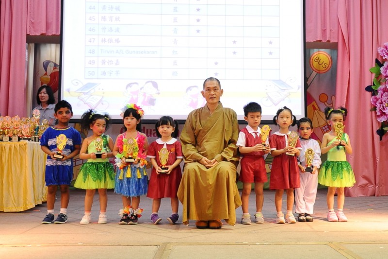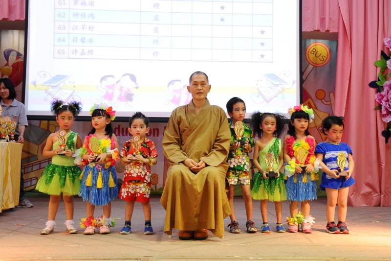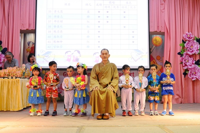 园长致词后便是颁奖环节。由于获奖的小朋友人数众多,园方在台上准备了投影显示小朋友们所获得的奖项名单,以方便观众得知其获奖项目。首先颁发的是最高荣誉奖。最高荣誉奖是颁发予成绩、唱歌比赛及绘画比赛都获得特优奖的小朋友。获得此奖项的小朋友是来自总园的颜睿恩(幼二莲花)、Ng Tze Xin (K2 Love)、叶婧雯(幼二大红花)及杜凯俪(幼二百合)。真如法师为颁奖人并与获得奖项的小朋友合照。接着,师父也颁发了成绩、唱歌及绘画优秀奖予得奖的小朋友们。檀香幼儿园爱心妈妈主任Ivy亦受邀颁发奖项给新港及发林分园获奖的各项比赛优胜者。