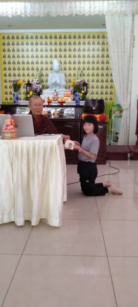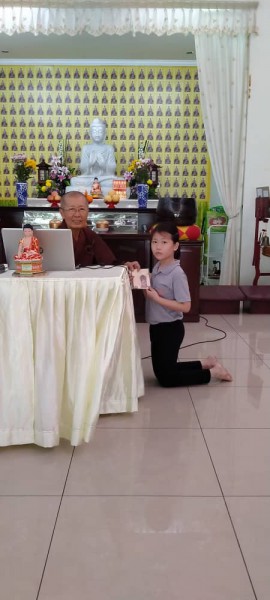 过后,结业颁奖仪式正式开始,首先是佛学班代表供养真念师父,赠送恩物予爱心老师及爱心爸妈。爱心家族也借此机会拍大合照。过后,由真念师父颁发策励奖给小菩萨,借此鼓励得奖者积极参与活动,希望其他小菩萨以他们为学习榜样。