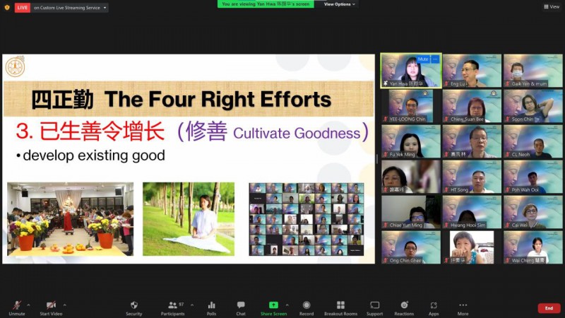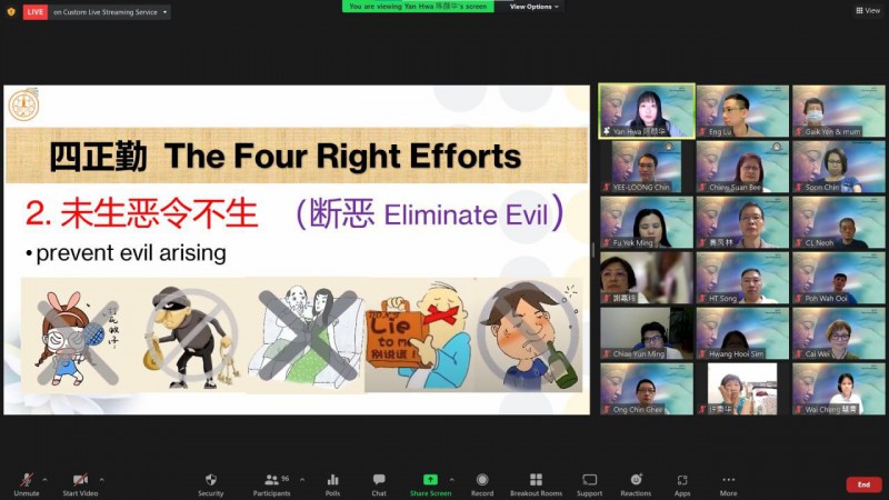 Submitted by Mengkeong on Thu, 21/10/2021 - 14:26 陈颜华居士15-10-2021 《普門品共修会》佛法分享者:陈颜华居士 在家僧团善法种子-陈颜华同修分享《四正勤》,为大家讲解如何从四个方面下手,在佛法上精进用功,去恶行善,即是:“已生恶令断灭,未生恶令不生;已生善令增长,未生善令生起。”希望大家一起精进,相互勉励,相互成长。 感恩陈颜华同修的用心与法布施。 感恩真醍法师的指导与宝贵的建议。 https://youtu.be/TKQ1GL8HI94 活动报导 Log in to post comments3171 reads