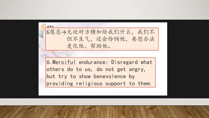 (六)慈忍:无论对方横加给我们什么,我们不但不生气,还会怜悯他,要想办法度化他、帮助他。