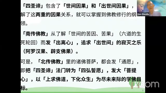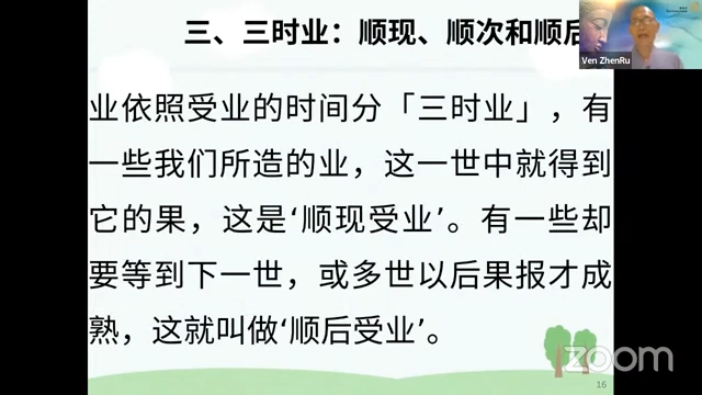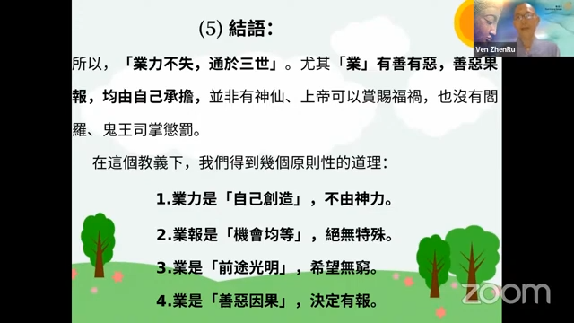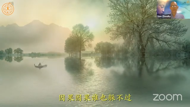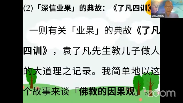 真如法师首先分享佛曲〈谁也躲不过〉,之后讲述「四圣谛」所讲的因果观有「世间因果」及「出世间因果」。真如法师并讲解佛教的因果法则以及业的特性,并分享《了凡四训》典故,最后真如法师勉励大众:「欲知前世因,今生受者是;欲知來世果,今生作者是」。