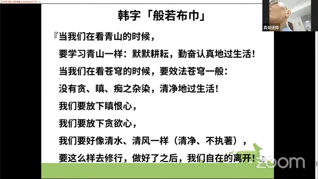 最后,真如法师以其参访「云门寺」时获赠该寺住持和尚尼明星法师手书的「般若布巾」题字内容大意作为结语: