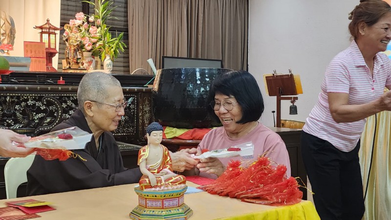今晚,槟城檀香寺大悲殿传来轻轻的谈笑声,那是许久未有的景象。原来是佛友们正为共修会庆生会忙前忙后。因疫情缘故,此庆生会已停办三年,在真信法师的带领下,每三月一次的庆生聚会再有因缘续办。