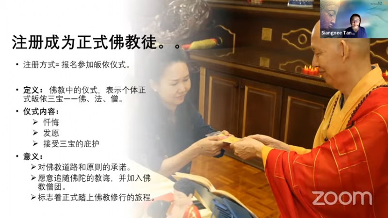 陈湘妮居士提到首先要「皈依」,也就是报名参加皈依仪式,注册成为正式的佛教徒。