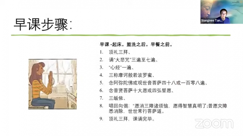 首先是早晨起床盥洗之后进行早课,礼佛三拜之后,念诵《大悲咒》、《心经》、《赞佛偈》、佛菩萨圣号,《三皈依》、回向,最后是礼佛三拜。
