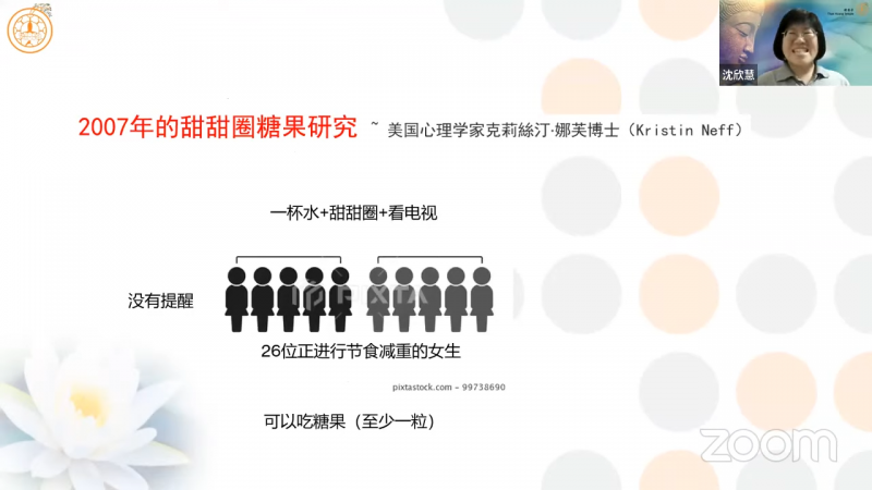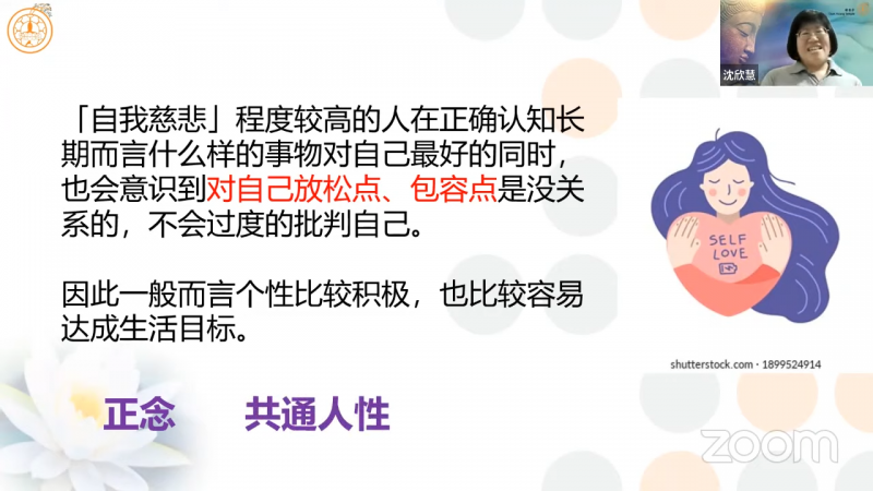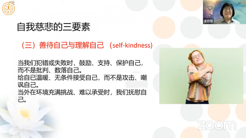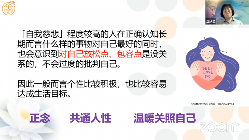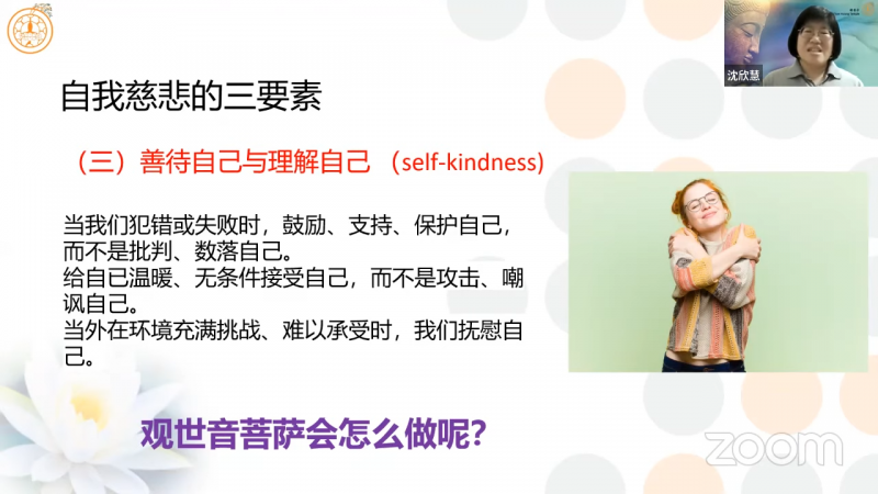 沈欣慧居士强调,「自我慈悲」程度较高的人,在正确认知方面,会知道什么样的事物才是对自己最好的;同时,也会意识到「对自己放松点、包容点」是没关系的,不会去过度的批判自己。