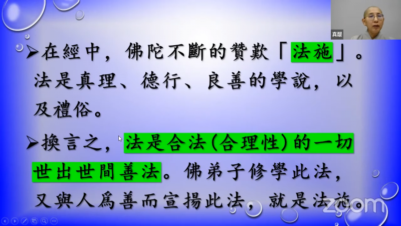 在经中,佛陀不断的赞叹「法施」。法是真理、德行、良善的学说,以及礼俗。