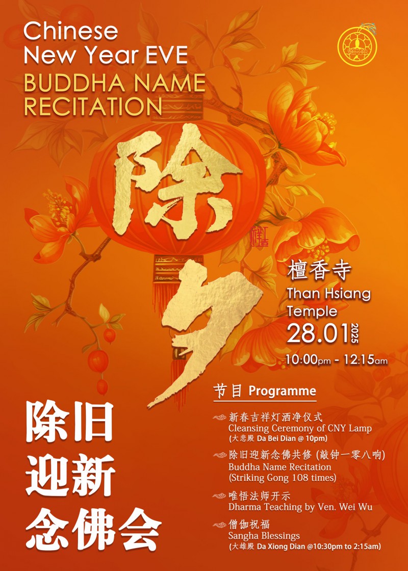 Submitted by soonchien on Mon, 06/01/2025 - 08:57 Body: 除夕除旧迎新念佛会 日期 :28.01.2025 (Tuesday) 时间 :10:00pm - 12:15am 地点 :檀香寺 将佛学讯息传递出去,以接引更多人学佛,继续在学佛道路上精进,听经闻法。 欲知详情,请点击以下连接 Follow us on:https://linktr.ee/thanhsiang 宣传 Log in to post comments1199 reads