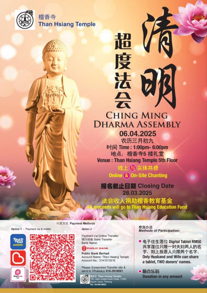 檀香寺将于6/4/2025 农历三月初九(星期日),下午一时至六时启建清明法会,共修《中峰国师三时系念佛事》一堂,集此功德,内资法会净土坛上各姓门中历代考妣宗亲及各人之累劫冤亲债主;外拔十方法界一切无祀男女孤魂等众,祈愿佛力接引,超生净土。