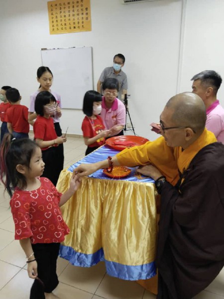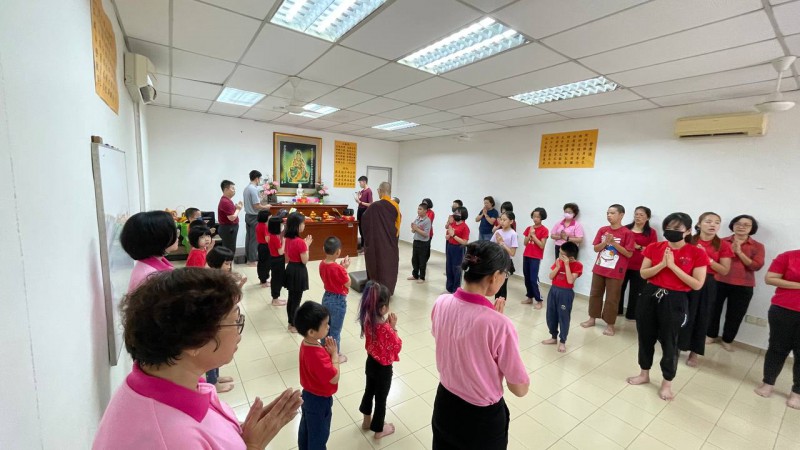 团拜活动于上午9时30分,在司仪坤艾老师的带领下,正式开始。真如法师为中尊,两位青年菩萨(政羲与睿恒)分别司职引磬和木鱼,协助法师带领大众进行早课,一起诵经共修。除了唱诵早课经文,学生们和大众也一同念诵《福智十善法》和《檀香四大信念》。看见小菩萨和青年菩萨能够朗朗上口,流利的唱诵,心里涌现了一股暖流,那是一种惊喜和感动。