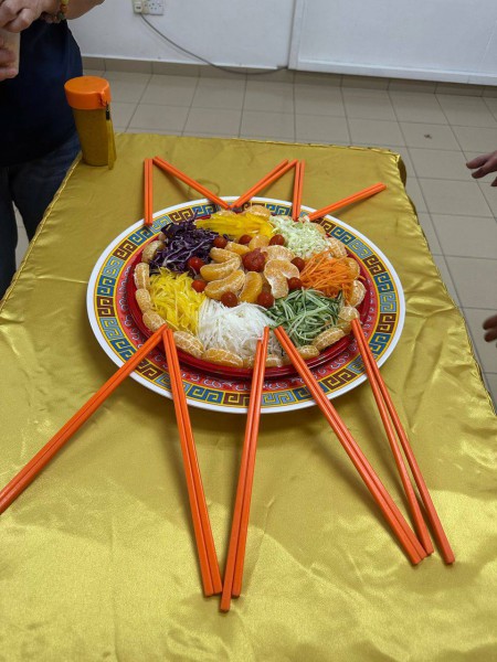 上午11时,大众分批与师父一起捞生。大家一同举起筷子,一边拌捞生,一边齐声高喊吉祥话,场面热闹非凡。随后,大家一同拍摄大合照,留下珍贵的回忆。