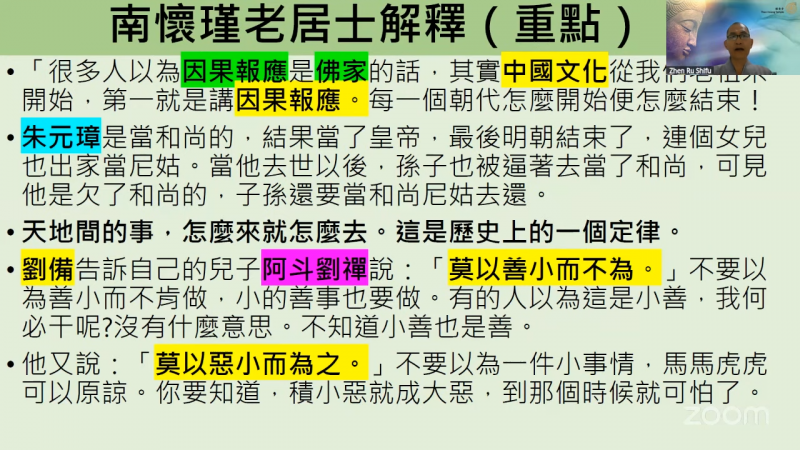 南怀瑾老居士提到,很多人以为因果报应是佛家的话,其实中国文化从我们老祖宗开始,第一就是讲因果报应!每一个朝代怎么开始便怎么结束,朱元璋是当和尚的,结果当了皇帝,最后明朝结束了,连个女儿也出家当尼姑。当他去世以后,孙子也被逼着去当了和尚,可见他是欠了和尚的,子孙还要当和尚尼姑去还。天地间的事,怎么来就怎么去。这是历史上的一个定律。