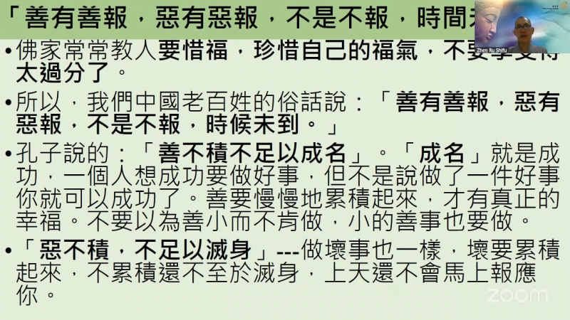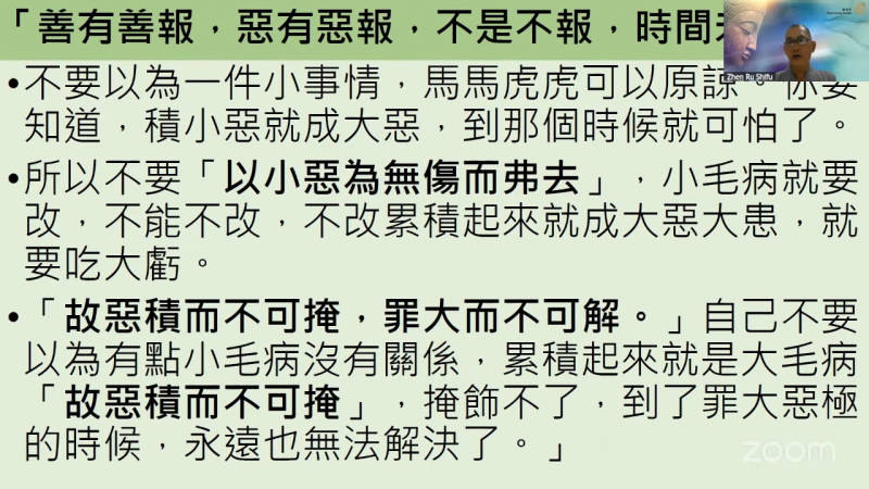 不要以为一件小事情,马马虎虎可以原谅。你要知道,积小恶就成大恶,到那个时候可怕了,所以不要「以小恶为无伤而弗去」,小毛病就要改,不能不改,不改累积起来就成大恶大患,就要吃大亏。