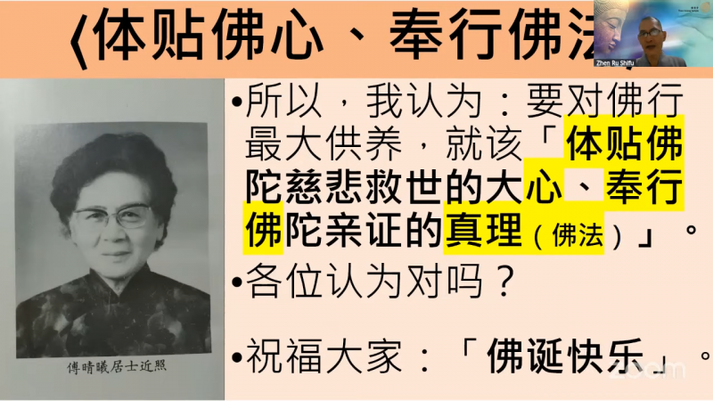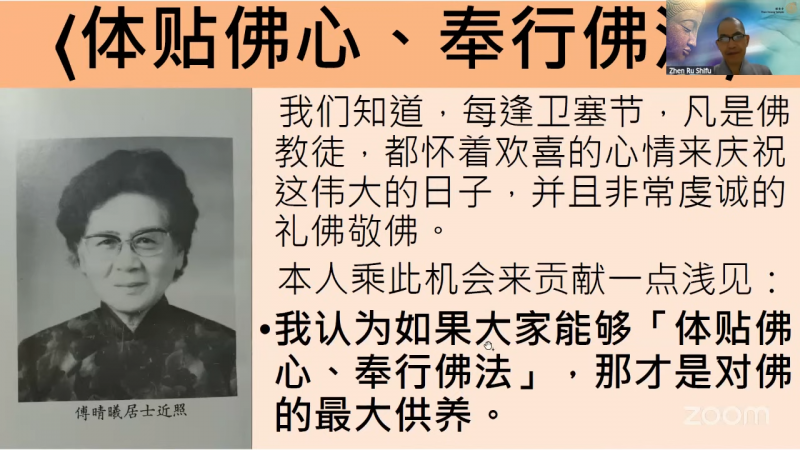 真如法师慈悲分享傅晴曦居士的佛理讲集《随慈悲光走真善路》谈到「体贴佛心、奉行佛法」,提到每逢卫塞节,凡是佛教徒,都怀着欢喜的心情来庆祝这伟大的日子,并且非常虔诚的礼佛敬佛。
