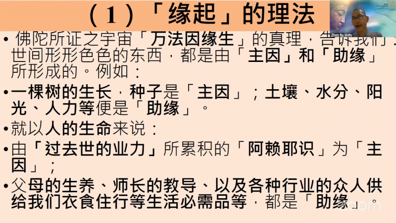 就以人的生命来说:由「过去世的业力」所累积的「阿赖耶识」为「主因」; 父母的生养、师长的教导、以及各种行业的众人供给我们衣食住行等生活必需品等,都是「助缘」。