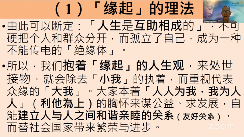 所以,我们抱着「缘起」的人生观,来处世接物,就会除去「小我」的执着,而重视代表众缘的「大我」。