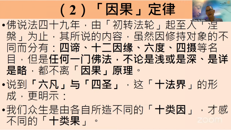 佛说法四十九年,由「初转法轮」起至入「涅槃」为止,其所说的内容,虽然因修持对象的不同而分有:四谛、十二因缘、六度、四摄等名目,但是任何一门佛法,不论是浅或是深、是详是略,都不离「因果」原理。