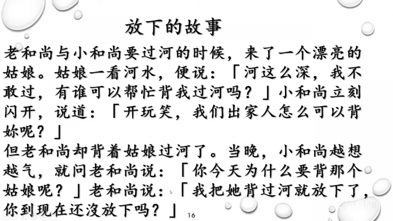 老和尚说:「我把她背过河就放下了, 你到现在还没放下吗?」
