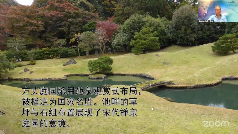 方丈庭园采用池泉观赏式布局,被指定为国家名胜。池畔的草坪与石组布置展现了宋代禅宗庭园的意境。