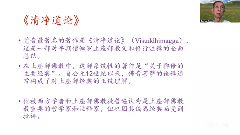 其生平主要是在斯里兰卡完成了系统化巴利文佛典的注释工作,代表作为《清净道论》,奠定了上座部佛教的理论基础。