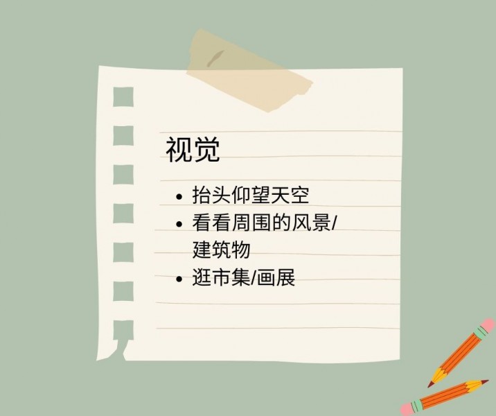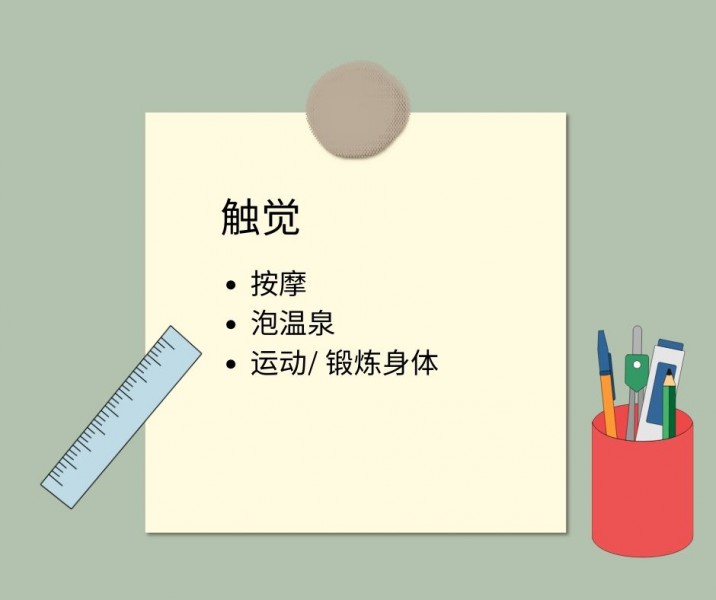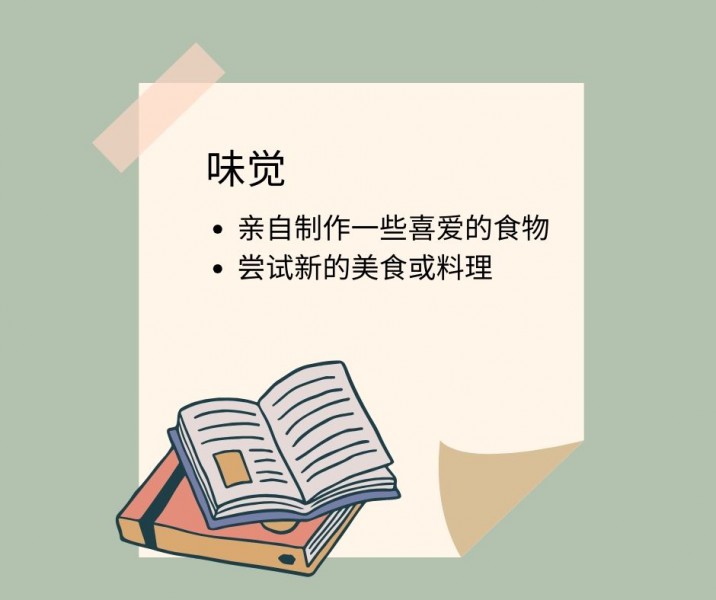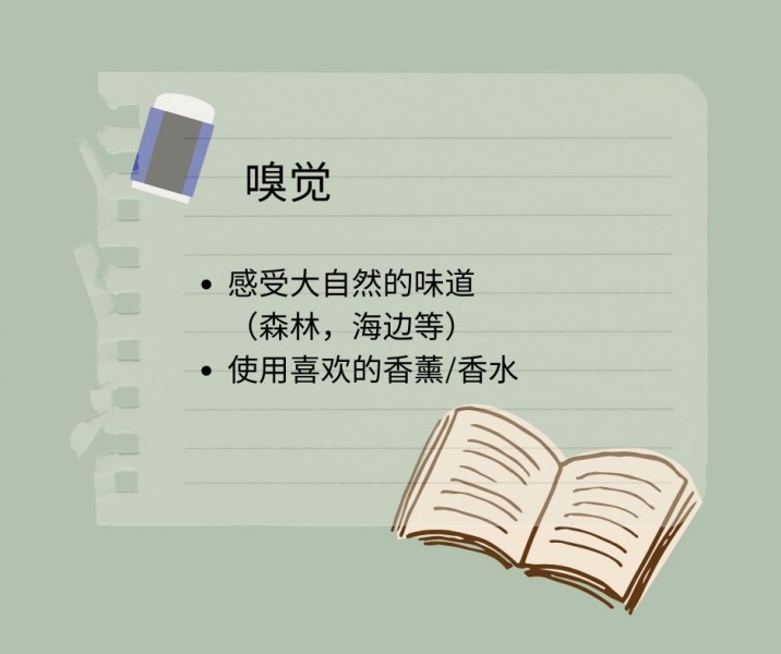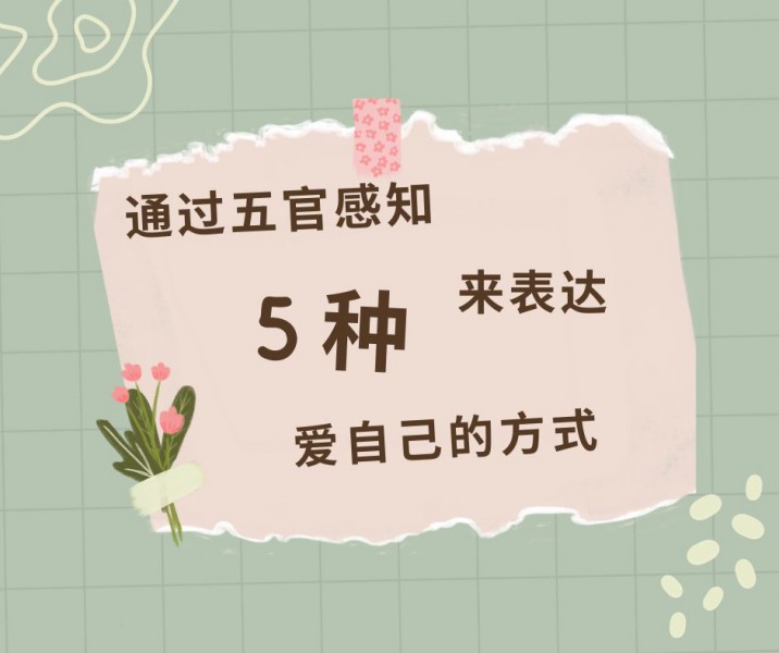 让我们来看一看,我们可以如何通过我们的五官感知(视觉,听觉,嗅觉,味觉和触觉)来爱自己。