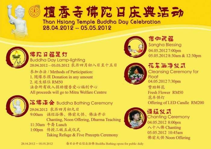 | 9:00-12:00 | Buddha Bathing Ceremony **Chanting, Noon Offering, Dharma Talk **Volunteers will guide the public to the respective venue on the spot |