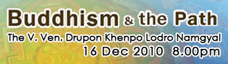 An accomplished scholar and meditation master, Drupon Khenpo Lodro Namgyal graduated in 1991 from Nalanda Institute at Rumtek Monastery, seat in Sikkhim of His Holiness the Gyalwa Karmapa Urgyen Trinley Dorje, Supreme Head of the Kagyu Lineage. In recognition of his excellence in scholarship, he was awarded the title of Khenpo and taught at the Nalanda Institute for two years. He then entered the traditional 3-year Mahamudra retreat at Pullahari Monastery under the Very Ven. Bokhar Rinpoche and Very Ven. Khenpo Tsultrim Gyamtso Rinpoche. At the end of the retreat in 1997, he was appointed Retreat Master and Principal Scholar and Teacher of the Rigpe Dorje Institute at Pullahari Monastery, Kathmandu, Nepal, seat of His Eminence Jamgon Kongtrul Rinpoche. In recognition of his excellence in practice, he was given the title “Drupon” (Retreat Master). Then on, he is known as Drupon Khenpo. Today, he is the principal teacher of philosophy to His Eminence the Fourth Jamgon Kongtrul Rinpoche, Lodro Chokyi Nyima; and principal scholar and teacher of His Eminence’s monasteries in India and Nepal, and the Rigpe Dorje Institutes in Nepal and India. Annually in December, he teaches at international foreign centres and from January to March, he teaches the philosophy and meditation programs at the Rigpe Dorje Institute in Pullahari. The next Rigpe Dorje program will be in January and March of 2011 and the information is available on www.jamgonkongtrul.org