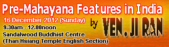 Submitted by seow on Thu, 11/01/2012 - 11:41 Pre-Mahayana Features in India - by Ven Ji Ran on 16 Dec 2012Announcement Log in to post comments 4593 reads