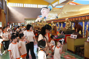 The sky was bright and sunny that morning and the traffic was rather smooth. We arrived at Wat Chayamangkalaram, more commonly known as the Reclining Buddha Temple by the locals about 9.20 am. After taking photos at the main gate, we took off our shoes to enter the temple. Everyone stood in front of the huge statue depicting the Buddha’s Parinibbana (complete passing away) and paid respect together. We then began to walk around and had pictures taken at the same time. The children were very inquisitive but showed good discipline when they looked around the main shrine with their teachers.