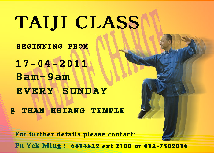 Submitted by seow on Sat, 04/09/2011 - 09:36 Free Taiji Class Opening on 17 April 2011Announcement Log in to post comments 4797 reads