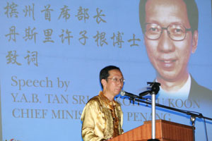 The Abbot of Than Hsiang Temple, Venerable Wei Wu, then presented a mock cheque for RM500,000 to Phor Tay High School for its relocation to Sungai Dua in Bayan Lepas district. On hand to receive the cheque was Datuk Tan Beng Hwa, the Assistant Secretary of the Phor Tay High School Board. This simple ceremony was witnessed by YAB Chief Minister of Penang, Tan Sri Dr Koh Tsu Koon, Datuk Wong Kam Hong, Deputy Culture, Arts and Heritage Minister, and representatives of Kwong Wah Yit Poh.