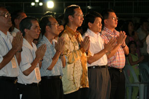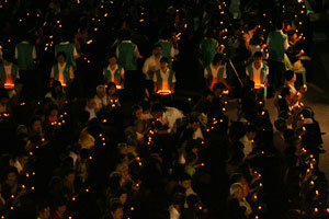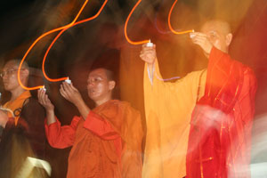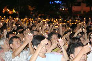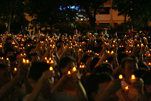 The crowd of devotees slowly built up on the night of 30 April 2007 at the car park beside Than Hsiang Temple to witness the “Merit and Wisdom Nite”, held in celebration of Wesak Eve and also to introduce the use of light emitting diode (LED) “candles” in place of the wax candles as a measure of keeping the temple's environs free of candle fumes and heat and for the personal safety of the devotees.