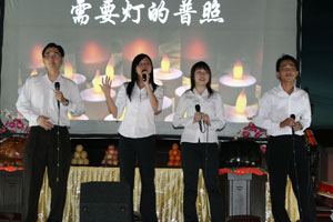 Sharp at 7.30pm, the ceremony started with the Than Hsiang Youth, smartly dressed in white shirt, black pants and light aquamarine green vest, carrying the LED candles to the stage front. This set the stage for the singing chant in praise of Sakyamuni Buddha. This was followed by two solo singers from the Than Hsiang Choir Group singing Buddhist songs. More Buddhist songs were rendered by the Than Hsiang Youth Group, a local singer, Jasmine, with a lovely lilting voice and another singer, Zhuang Xue Zhong, who came all the way from Kuala Lumpur.