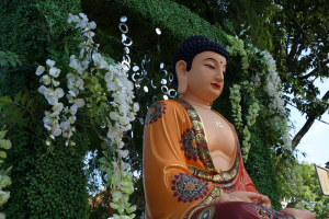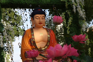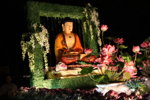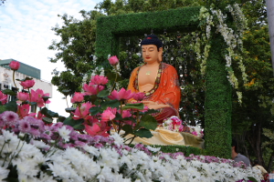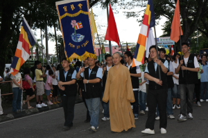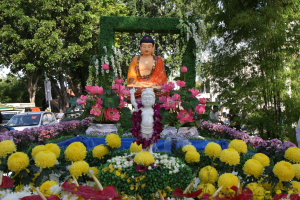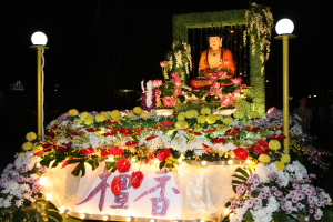 During the float procession, most devotees held flowers and five-colored Buddhist flags as a sign to welcome the Buddha statue. Some of them even chanted the name of Sakyamuni Buddha during the procession.