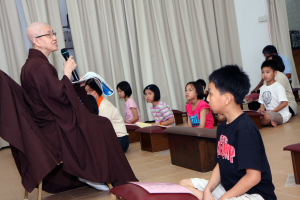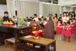 On 27 April 2012, Than Hsiang Temple organized Bathing the Buddha Ceremony for kindergarten and Wan Ching Yuen. At 9 a.m. in the morning, more than 100 kindergarten children and teachers attended the Bathing the Buddha Ceremony at the Great Compassion Hall. Venerable Wu Guo led them in chanting and delivered a talk afterwards. In her talk, Venerable Wu Guo explained the origin of Wesak and the significance of Bathing the Buddha to the children and the teachers.