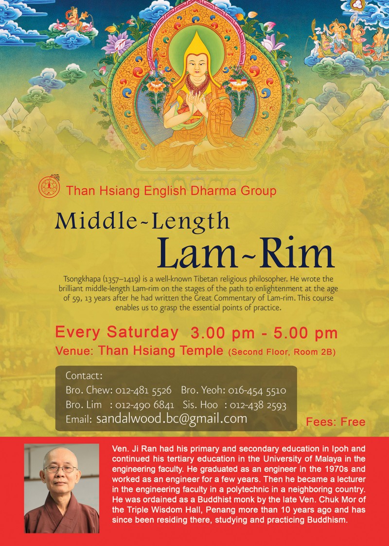 Tsongkhapa (1357–1419) is a well-known Tibetan religious philosopher. He wrote the brilliant middle-length Lam-rim on the stages of the path to enlightenment at the age of 59, 13 years after he had written the Great Commentary of Lam-rim. This course enables us to grasp the essential points of practice.