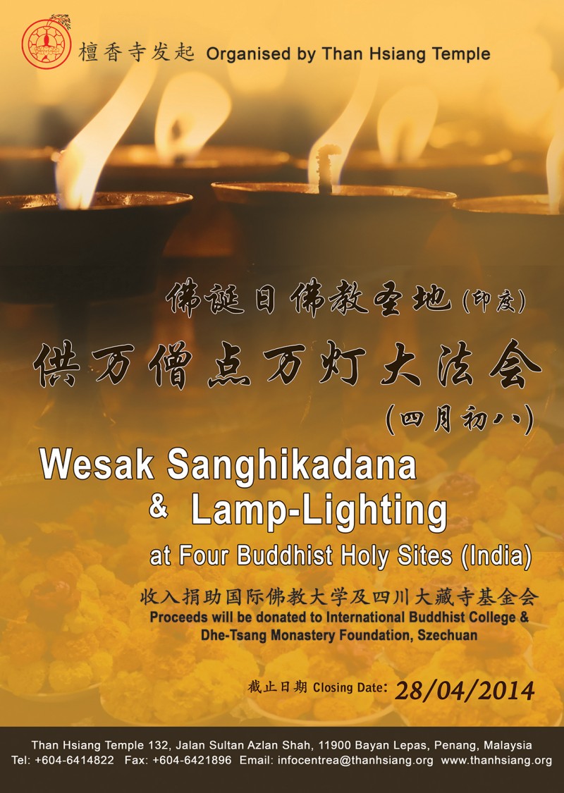 Submitted by Ah Jin on Thu, 03/13/2014 - 06:51 Wesak Sanghikadana & Lamp-Lighting at Four Buddhist Holy Sites (India)Announcement Log in to post comments 3519 reads