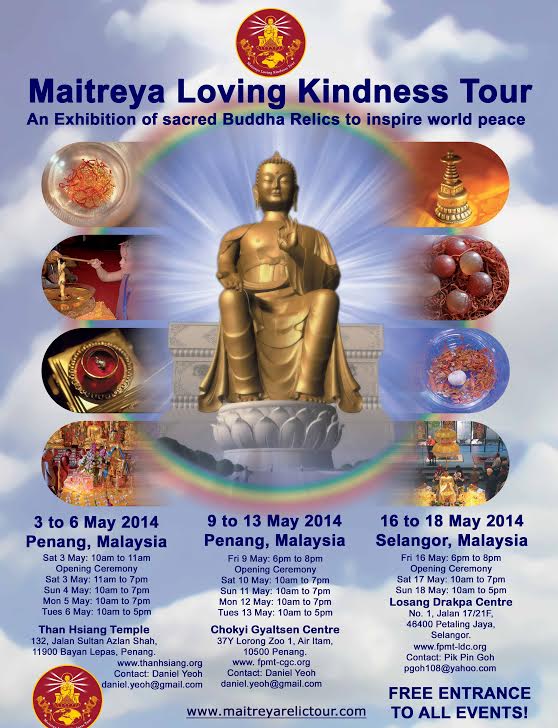 Maitreya Loving Kindness Tour, a public exhibition of ancient and sacred relics of the historical Buddha Shakyamuni and other great Buddhist masters from India Tibet, Korea & China will be on display in Malaysia during May at these locations:-