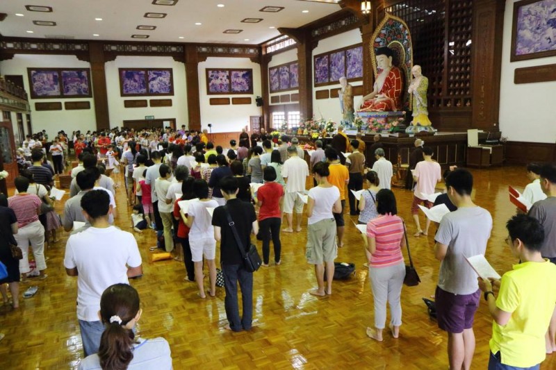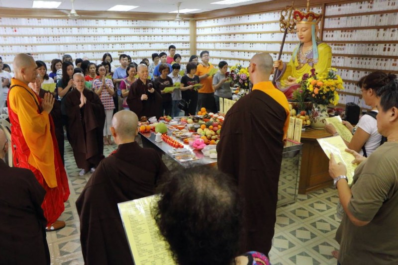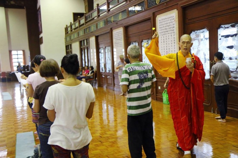 15th May was a beautiful Sunday. Helpful volunteers turned up at the temple early in the morning to get ready for the day’s events. At 9.30am devotees flocked to the main shrine at Level 6 to participate in ‘Buddha bathing’, listening to Dharma talks and receiving blessings from Sangha members. They continued with the noon offering at 10.30am after which they were led by Sangha members to perform sharing of merits at Dayuandian on the ground floor.