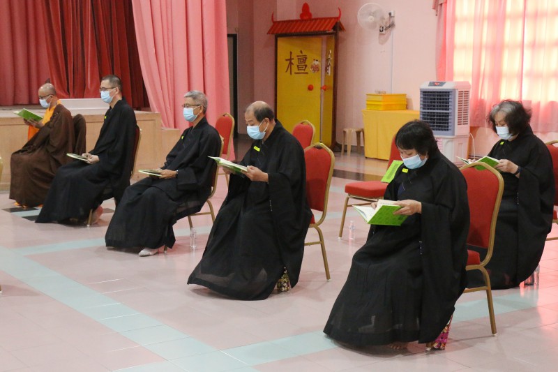 The Covid-19 Corona Virus pandemic is not over yet; public places including places of worship where crowd gathering is involved are still subject to strict regulations of the Movement Control Order imposed by the authority to curb the spread of the pandemic. All group activities must comply with the Standard Operating Procedures (SOP) stipulated by the government. It was under such circumstances that Than Hsiang Temple held its Filial Piety Dharma Assembly 2020 as scheduled. Group cultivation sessions were held nightly at the Great Compassion Shrine on the ground floor from September 7 to 12. The schedule included chanting of Amitabha Sutra from September 7 to 9, and Water Repentance from September 10 to 12.