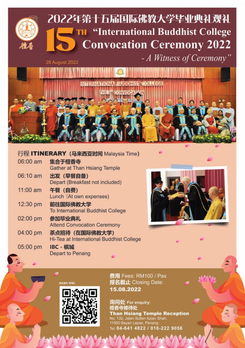 International Buddhist College is organizing 15th International Buddhist College Convocation Ceremony on 28/8/2022. Hereby Than Hsiang Temple is organizing International Buddhist College Convocation Ceremony 2022 - A Witness of Ceremony Tour. Welcome all the devotees to join the trip and ceremony.