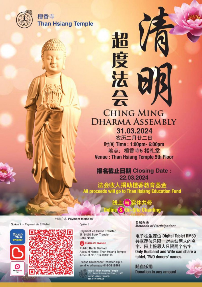 Than Hsiang Temple will organise Ching Ming Dhama Assembly on 31 March 2024 (Sunday). There will be Three Sessions of Pure Land Chanting conducted by Sangha Members from 1pm to 6pm. Merits accrued will be transferred for the well-being of the nation and society as well as our departed ancestors, relatives and friends, karmic creditors, etc.