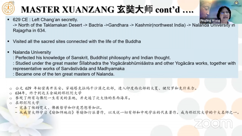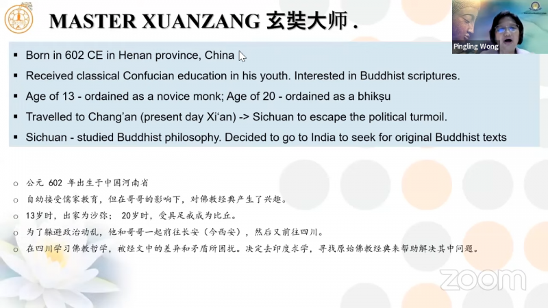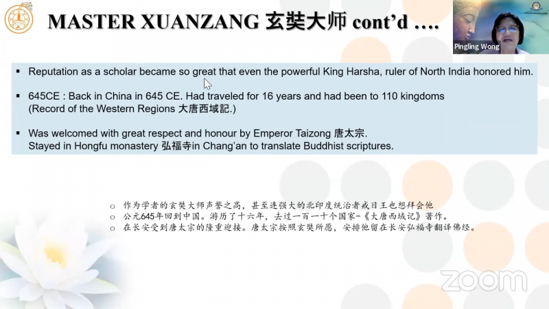 Here, Sister Wong Ping Ling will start to talk about the Biography of Master Xuan Zang.