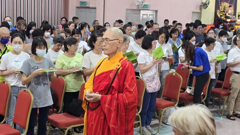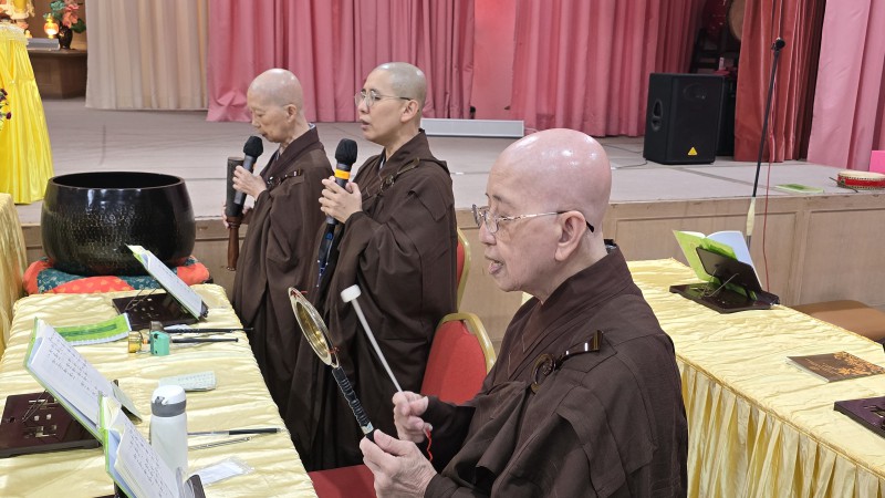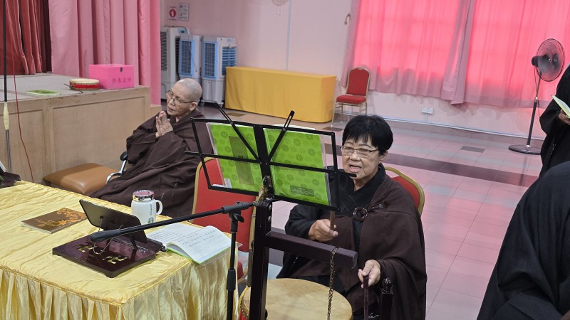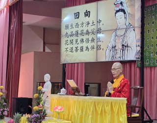 Ven. Zhen Ru shared teachings, mentioning that the late Ven. Sheng yan Fashi emphasized that the "Three Periods of Mindfulness Ritual" uses the power of the Dharma to invite wandering spirits to the Dharma assembly, where they can listen to teachings, recite sutras, chant the Buddha's name, repent, make vows, and take refuge in the Triple Gem. Through this, they are offered Dharma as a form of giving, helping them find peace and be reborn in the Pure Land. Ven. Zhen Ru also explained the essence of the "Three Periods of Mindfulness Ritual" and clarified the true meaning of the Ullambana Festival.